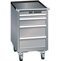 Mobilne szafki warsztatowe Lista, 4 lub 5 szuflad. Żebrowana podkładka antypoślizgowa na górze szafki. Ruch umożliwiają 4 kółka i uchwyt do przenoszenia. Zamek na klucz. Optymalne wykorzystanie dzięki pełnemu wysuwowi i optymalnej wysokości frontu szuflady. Doskonała ochrona przed kurzem, cieczami i uszkodzeniami mechanicznymi dzięki zamkniętej ramie z powierzchnią odporną na uderzenia i ścieranie. System zabezpieczający przed wypadnięciem szuflady oraz blokada każdej szuflady osobno. Ochrona antykorozyjna poprzez elektroforetyczne malowanie zanurzeniowe i natryskiwanie. Zoptymalizowana przestrzeń do przechowywania i organizacja dzięki przegródkom LISTA dostosowanym do każdego zastosowania oraz szufladom wyposażonym w rowki i perforacje. Profesjonalne etykietowanie z oprogramowaniem LISTA Script i odchylanym uchwytem na etykiety. Idealnie cichy ruch dzięki prowadnicy bez poprzeczki. Przegródki do szuflad nie są dołączone. Należy je zakupić osobno. Maks. obciążenie (kg) : 75 kg