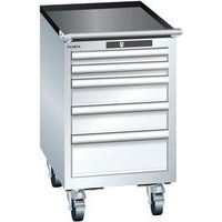 Mobilne szafki warsztatowe Lista, 4 lub 5 szuflad. Żebrowana podkładka antypoślizgowa na górze szafki. Ruch umożliwiają 4 kółka i uchwyt do przenoszenia. Zamek na klucz. Optymalne wykorzystanie dzięki pełnemu wysuwowi i optymalnej wysokości frontu szuflady. Doskonała ochrona przed kurzem, cieczami i uszkodzeniami mechanicznymi dzięki zamkniętej ramie z powierzchnią odporną na uderzenia i ścieranie. System zabezpieczający przed wypadnięciem szuflady oraz blokada każdej szuflady osobno. Ochrona antykorozyjna poprzez elektroforetyczne malowanie zanurzeniowe i natryskiwanie. Zoptymalizowana przestrzeń do przechowywania i organizacja dzięki przegródkom LISTA dostosowanym do każdego zastosowania oraz szufladom wyposażonym w rowki i perforacje. Profesjonalne etykietowanie z oprogramowaniem LISTA Script i odchylanym uchwytem na etykiety. Idealnie cichy ruch dzięki prowadnicy bez poprzeczki. Przegródki do szuflad nie są dołączone. Należy je zakupić osobno. Maks. obciążenie (kg) : 75 kg