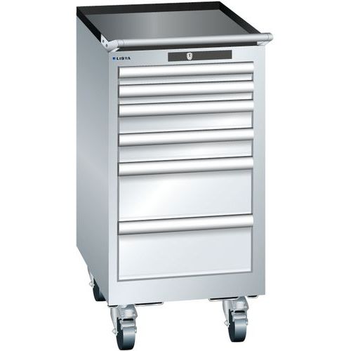Żebrowana podkładka antypoślizgowa na górze szafki. 4 kółka i uchwyt do przenoszenia umożliwiają przemieszczanie. Zamek na klucz. Optymalne wykorzystanie dzięki pełnemu wysuwowi i optymalnej wysokości frontu szuflady. Doskonała ochrona przed kurzem, cieczami i uszkodzeniami mechanicznymi dzięki zamkniętej ramie z powierzchnią odporną na uderzenia i ścieranie. System zabezpieczający przed wypadnięciem szuflady oraz blokada każdej szuflady osobno. Ochrona antykorozyjna poprzez elektroforetyczne malowanie zanurzeniowe i natryskiwanie. Zoptymalizowana przestrzeń do przechowywania i organizacja dzięki przegródkom LISTA dostosowanym do każdego zastosowania oraz szufladom wyposażonym w rowki i perforacje. Profesjonalne etykietowanie z oprogramowaniem LISTA Script i odchylanym uchwytem na etykiety. Idealnie cichy ruch dzięki prowadnicy bez poprzeczki. Przegródki do szuflad nie są dołączone. Należy je zakupić osobno. Maks. obciążenie (kg) : 75 kg