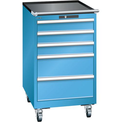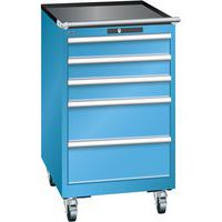 Mobilna szafka warsztatowa z szufladami LISTA, 5 szuflad = 3x100 + 2x200mm, 564x725x990mm, jasnoniebieska