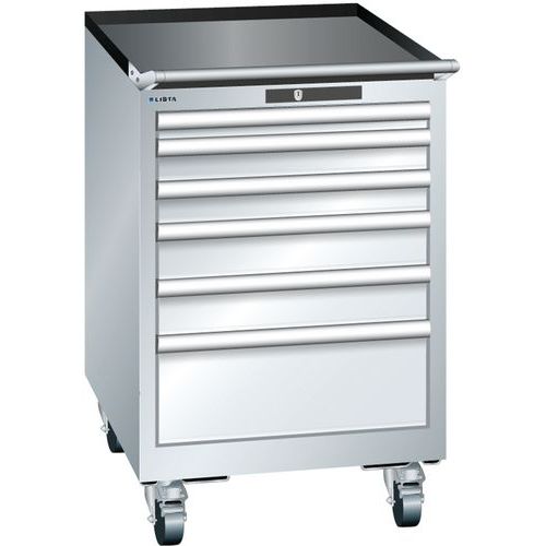 Żebrowana podkładka antypoślizgowa na górze szafki. 4 kółka i uchwyt do przenoszenia umożliwiają przemieszczanie. Zamek na klucz. Optymalne wykorzystanie dzięki pełnemu wysuwowi i optymalnej wysokości frontu szuflady. Doskonała ochrona przed kurzem, cieczami i uszkodzeniami mechanicznymi dzięki zamkniętej ramie z powierzchnią odporną na uderzenia i ścieranie. System zabezpieczający przed wypadnięciem szuflady oraz blokada każdej szuflady osobno. Ochrona antykorozyjna poprzez elektroforetyczne malowanie zanurzeniowe i natryskiwanie. Zoptymalizowana przestrzeń do przechowywania i organizacja dzięki przegródkom LISTA dostosowanym do każdego zastosowania oraz szufladom wyposażonym w rowki i perforacje. Profesjonalne etykietowanie z oprogramowaniem LISTA Script i odchylanym uchwytem na etykiety. Idealnie cichy ruch dzięki prowadnicy bez poprzeczki. Przegródki do szuflad nie są dołączone. Należy je zakupić osobno. Maks. obciążenie (kg) : 75 kg