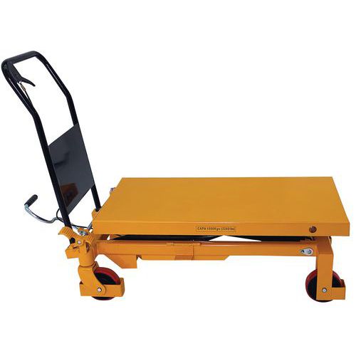 Mobilna platforma o nośności 1000 kg. Podnoszenie manualne za pomocą pedału. Ruch umożliwiają dwa nieruchome i dwa obrotowe kółka, w tym jedno z hamulcem.