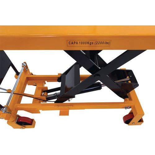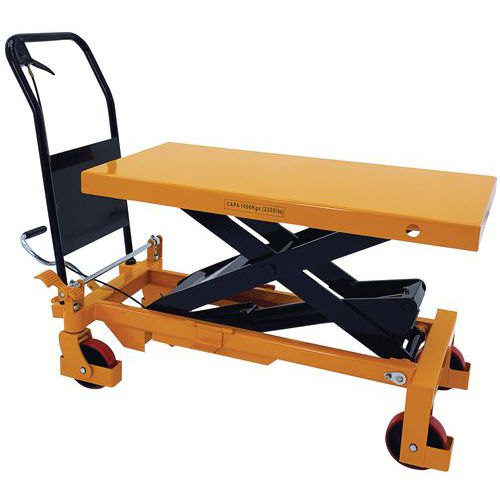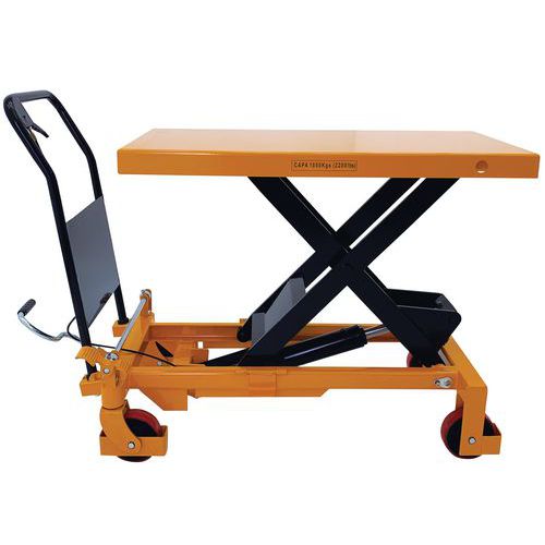 Mobilna platforma o nośności 1000 kg. Podnoszenie manualne za pomocą pedału. Ruch umożliwiają dwa nieruchome i dwa obrotowe kółka, w tym jedno z hamulcem. Gwarancja producenta dla klienta : 10 lat Nośność (kg) : 1000 kg