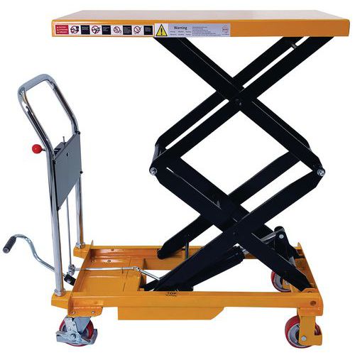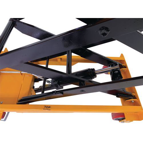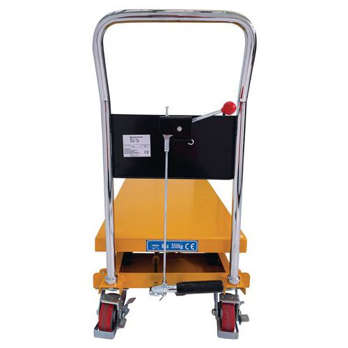 Hydrauliczny stół podnośny z prostokątnym blatem. Podnoszenie manualne za pomocą pedału. Mobilność zapewniają dwa nieruchome i dwa obrotowe koła. Nośność (kg) : 350 kg Gwarancja producenta dla klienta : 10 lat