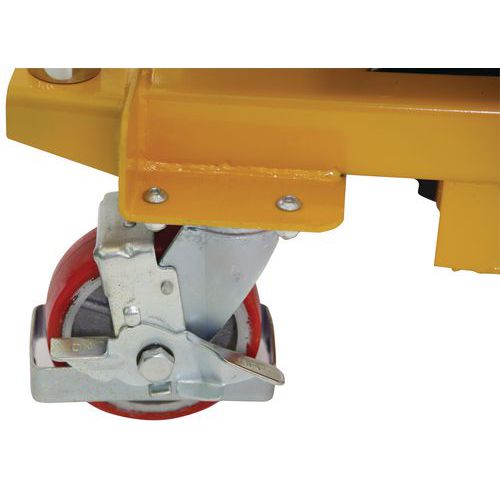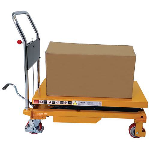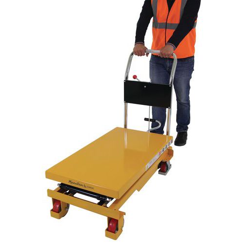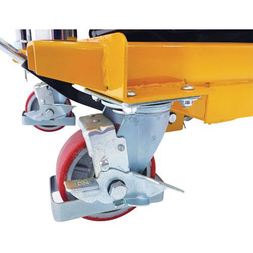 Hydrauliczny stół podnośny z prostokątnym blatem. Podnoszenie manualne za pomocą pedału. Mobilność zapewniają dwa nieruchome i dwa obrotowe koła.