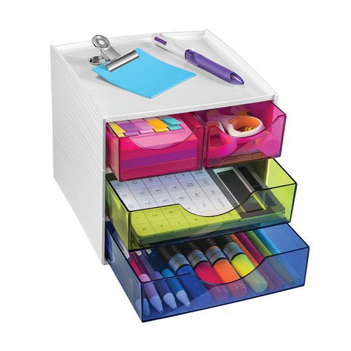 Moduły pamięci MyCube mini wykonane są z tworzywa sztucznego. Moduły te łatwo mieszczą się na biurku i pomagają gromadzić i przechowywać wszystkie drobne akcesoria i artykuły biurowe. Ergonomiczne uchwyty zapewniają łatwe otwieranie szuflad. Gniazda wyposażone są w ograniczniki zabezpieczające przed wypadaniem, ale w razie potrzeby można je łatwo wyjąć z modułu.