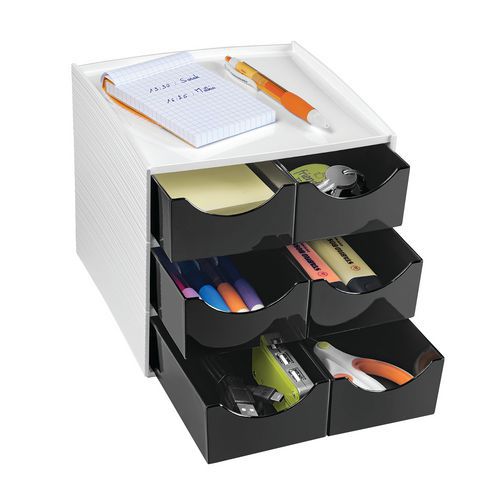 Moduły pamięci MyCube mini wykonane są z tworzywa sztucznego. Moduły te łatwo mieszczą się na biurku i pomagają gromadzić i przechowywać wszystkie drobne akcesoria i artykuły biurowe. Ergonomiczne uchwyty zapewniają łatwe otwieranie szuflad. Gniazda wyposażone są w ograniczniki zabezpieczające przed wypadaniem, ale w razie potrzeby można je łatwo wyjąć z modułu.