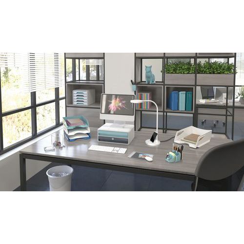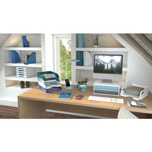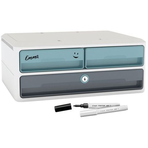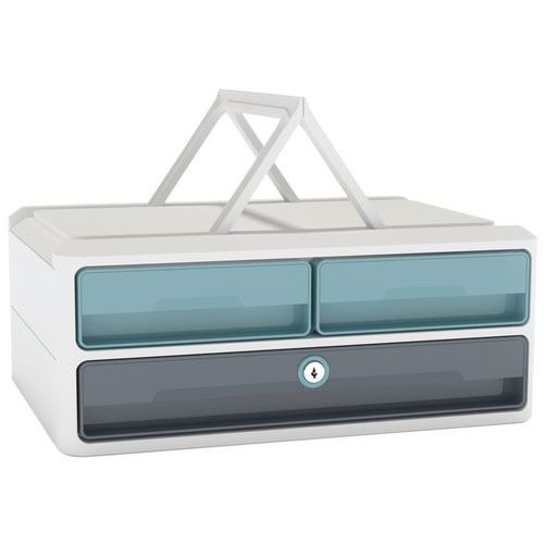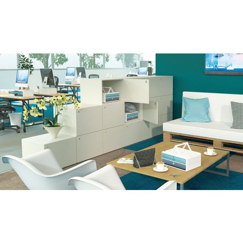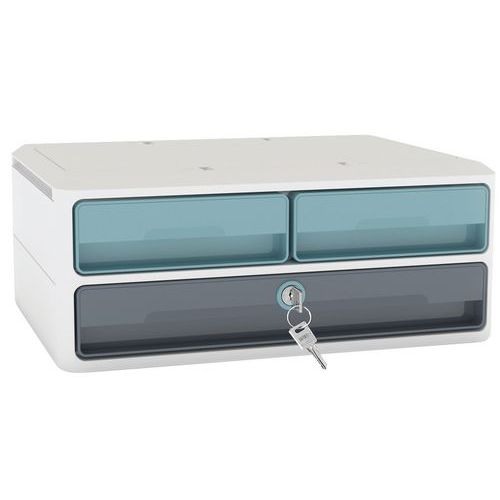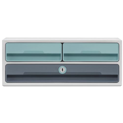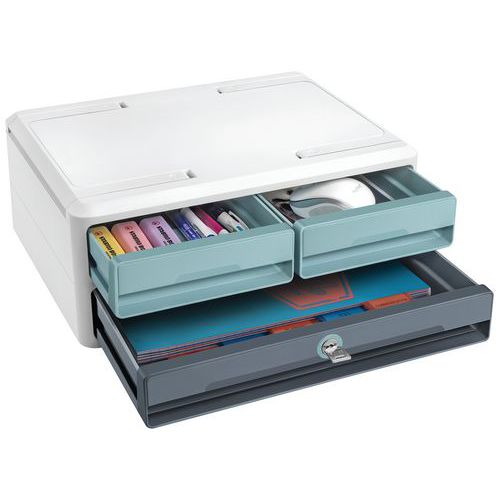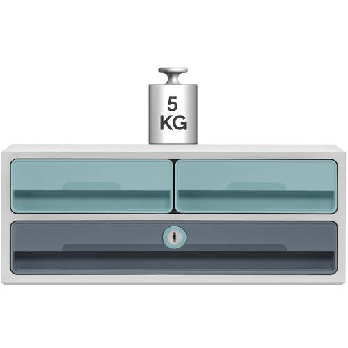 Szafki Moov'Up z dwiema mniejszymi szufladami i jedną dużą szufladą do przechowywania wszystkiego, od artykułów biurowych po dokumenty i tablety. Szuflady można indeksować i dostosowywać za pomocą markerów na bazie wody. Moduły są niezwykle wytrzymałe i mogą służyć jako stojak na ekran (do 5 kg). Szuflady zamykane na zamek, posiada otwór do montażu linki zabezpieczającej przed kradzieżą. Dzięki czterem wbudowanym wycięciom można bezpiecznie układać kilka jednostek jedna na drugiej.