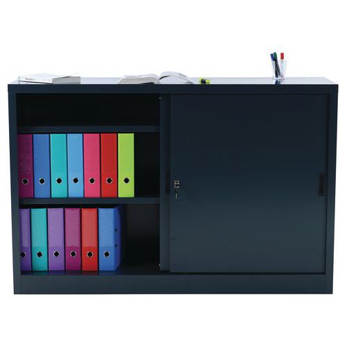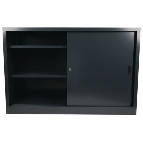 Niskie metalowe szafki do przechowywania akt, dokumentów, segregatorów itp. Zamykane na klucz drzwi przesuwne, z poręczą, zapewniają oszczędność miejsca. Wyposażone w cztery półki. Półki z regulacją wysokości co 36 mm, możliwość użycia segregatorów zawieszanych (brak w zestawie). Nośność maksymalna 60 kg półkę.