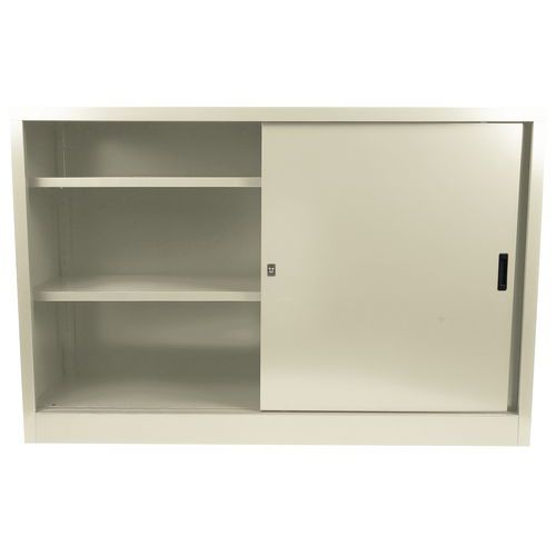 Niskie metalowe szafki do przechowywania akt, dokumentów, segregatorów itp. Zamykane na klucz drzwi przesuwne, z poręczą, zapewniają oszczędność miejsca. Wyposażone w cztery półki. Półki z regulacją wysokości co 36 mm, możliwość użycia segregatorów zawieszanych (brak w zestawie). Nośność maksymalna 60 kg półkę.