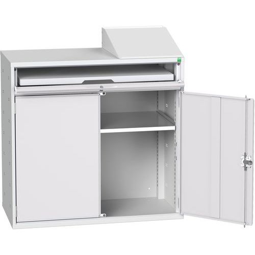 - Zawiera jedną ocynkowaną półkę z regulacją wysokości o nośności 75 kg i przejściem na kable oraz pochyłe biurko.