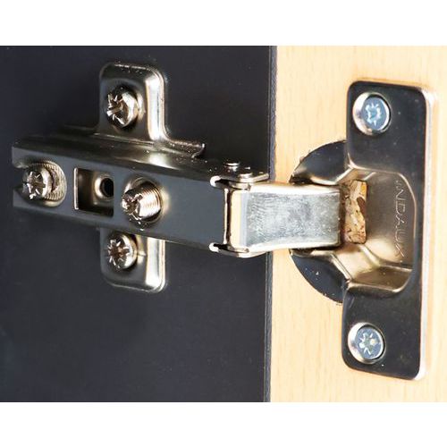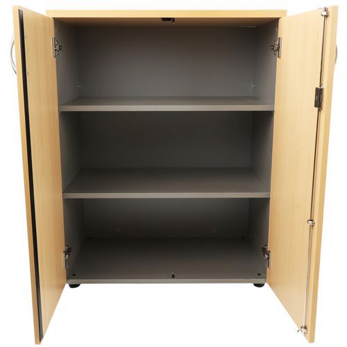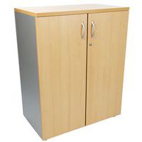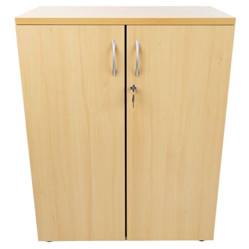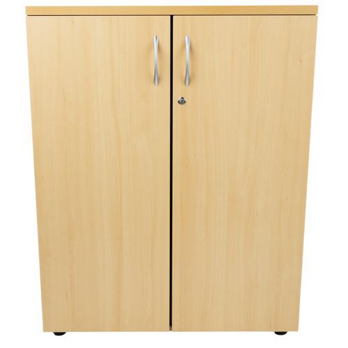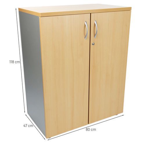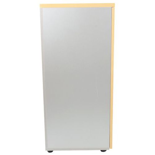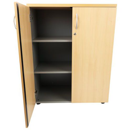 Niska szafka do biura na dokumenty i segregatory. Wykonana z płyty wiórowej. Wyposażona w dwie półki. Możliwość zamknięcia szafki na klucz. Metalowa rączka w kolorze aluminium. Stopki z możliwością regulacji wysokości.