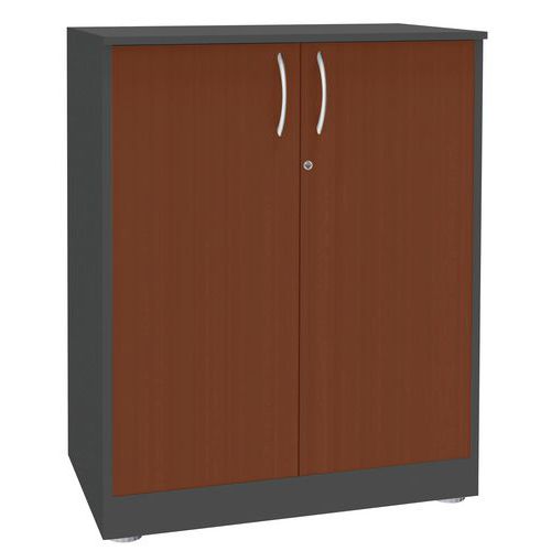 Niska szafka do biura na dokumenty i segregatory. Wykonana z płyty wiórowej. Wyposażona w dwie półki. Możliwość zamknięcia szafki na klucz. Metalowa rączka w kolorze aluminium. Stopki z możliwością regulacji wysokości.