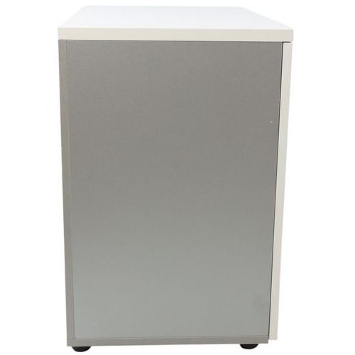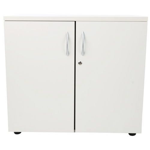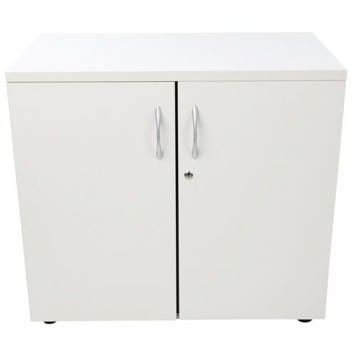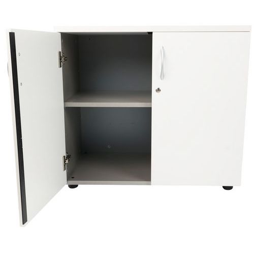 Niska szafka aktowa do biura na dokumenty i segregatory. Wykonana z płyty wiórowej. Wyposażona w jedną półkę. Możliwość zamknięcia szafki na klucz. Metalowa rączka w kolorze aluminium. Stopki z możliwością regulacji wysokości.