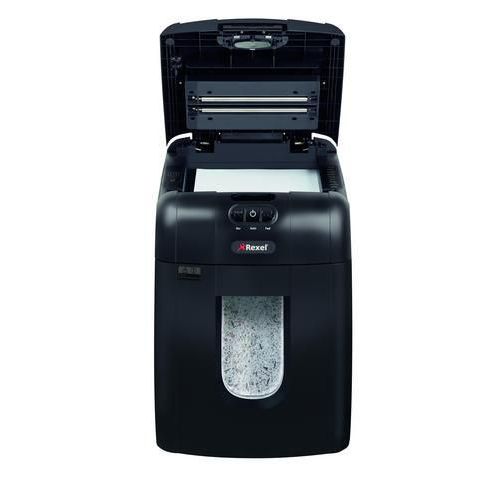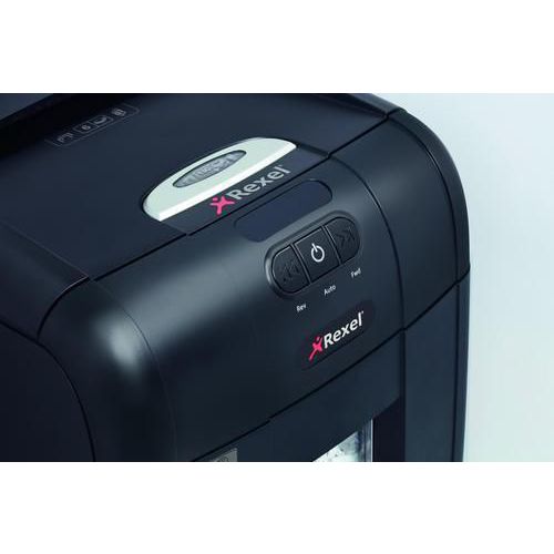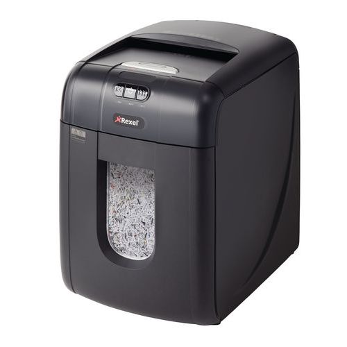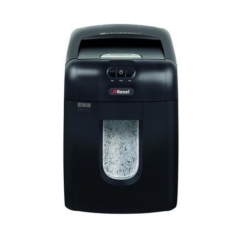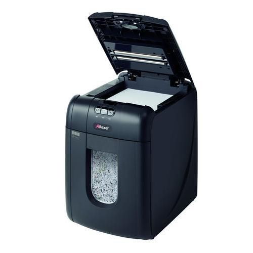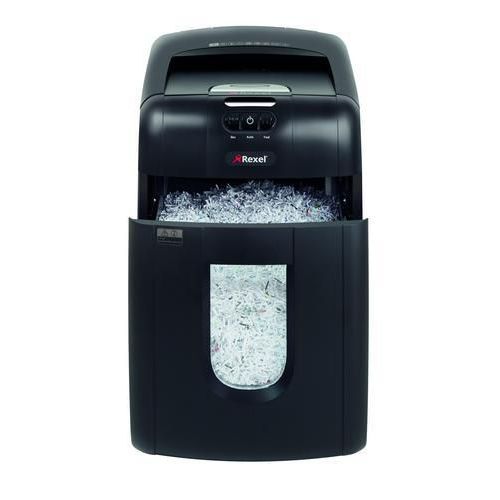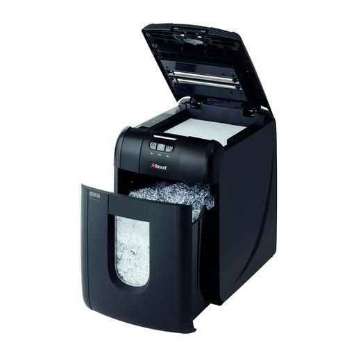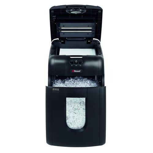 - Niszczarka REXEL Auto+ 130M z automatycznym podajnikiem o pojemności zasobnika 130 stron A4 (80 g/m2) i 140 stron A4 (70 g/m2) tnie dokumenty w kierunku poprzecznym na ścinki o rozmiarach 2 x 15 mm, do 6 kartek naraz.