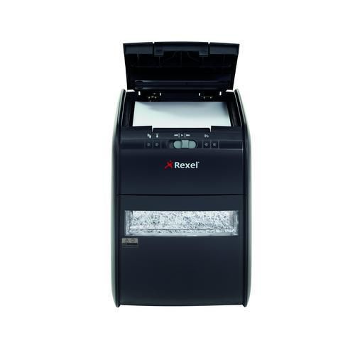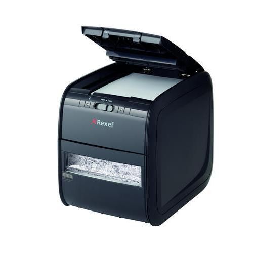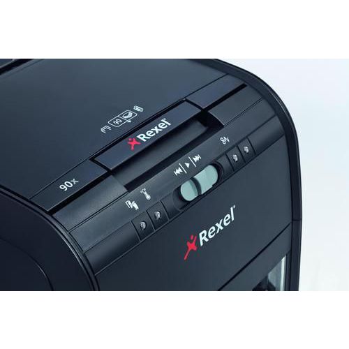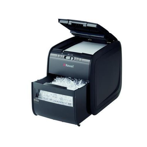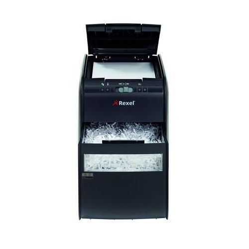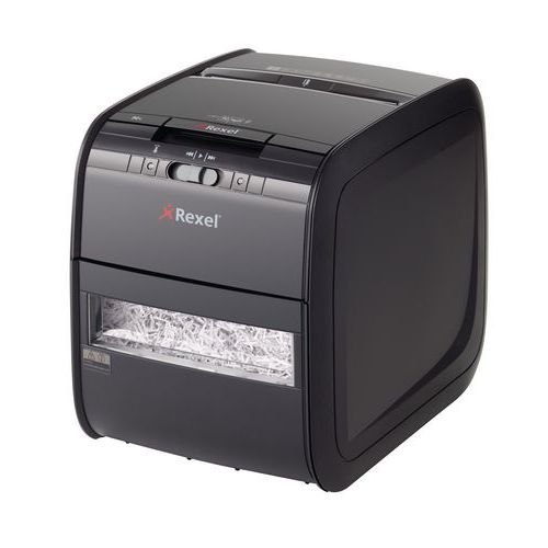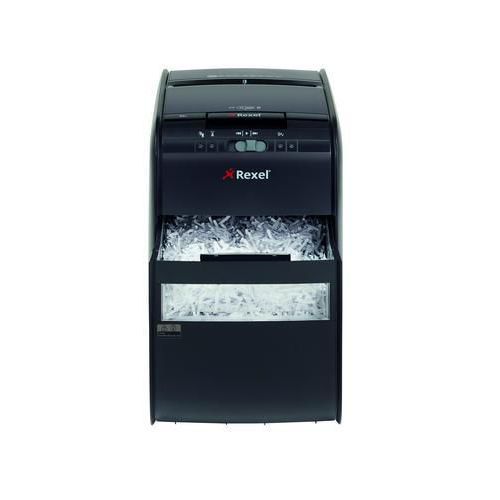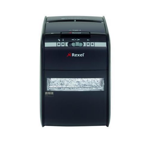 - Niszczarka REXEL AUTO+ 90X z automatycznym podajnikiem o pojemności zasobnika 90 stron A4 (80 g/m2) tnie dokumenty w kierunku poprzecznym na ścinki o rozmiarach 4 x 45 mm, do 6 kartek naraz.