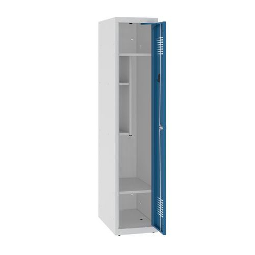 Niższa szafka szatniowa szkolna, 1 słupek, 300 mm, szara/niebieska, zamek cylindryczny