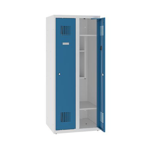 Niższa szafka szatniowa szkolna, 2 słupky, 300 mm, szara/niebieska, zamek cylindryczny
