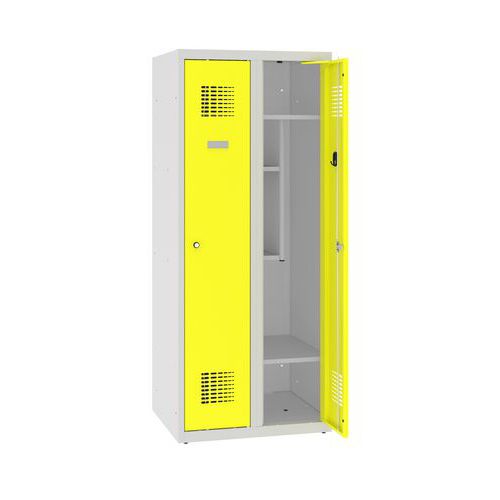 Niższa szafka szatniowa szkolna, 2 słupky, 300 mm, szara/żółta, zamek cylindryczny