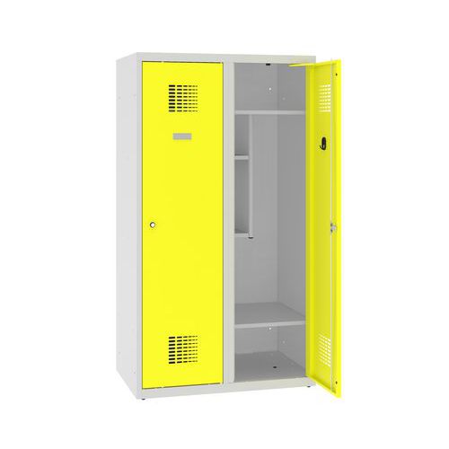 Dwuprzedziałowe szafki szatniowe o obniżonej wysokości. Mogą być używane w szkołach przez uczniów nauczania początkowego.