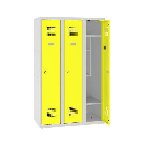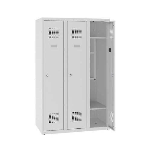 Niższe szafki szatniowe szkolne, 3 słupki, 300 mm, zamek cylindryczny ryglowany w trzech punktach