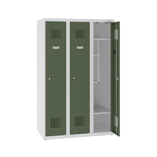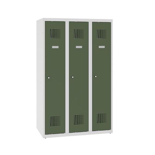 Niższa szafka szatniowa szkolna, 3 kolumny, 300 mm, szara/zielona, zamek cylindryczny trzypunktowy