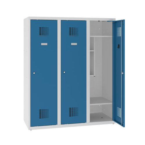 Trzydrzwiowe szafki szatniowe o obniżonej wysokości. Mogą być używane w szkołach przez uczniów nauczania początkowego.
