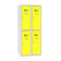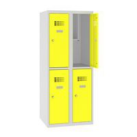 Niższa szafka szatniowa szkolna, 4 przedziały, 300 mm, szara/żółta, zamek cylindryczny