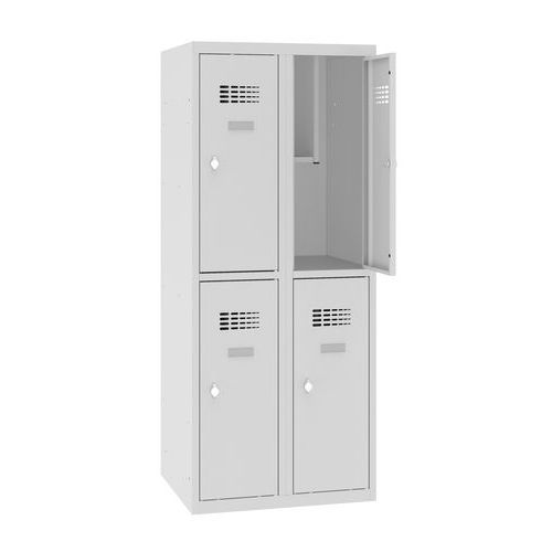 Szafki szatniowe o konstrukcji spawanej, z czterema przedziałami, przeznaczone do szkół.