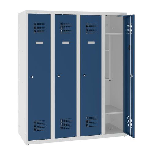 Niższe szafki szatniowe szkolne, 4 słupki, 300 mm, zamek cylindryczny