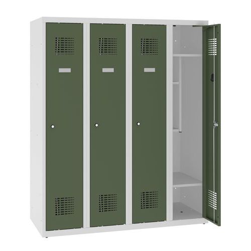 Niższa szafka szatniowa szkolna, 4 słupky, 300 mm, szara/zielony, zamek cylindryczny
