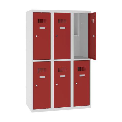 Niższa szafka szatniowa szkolna, 6 przedziałów, 300 mm, szara/czerwona, zamek cylindryczny