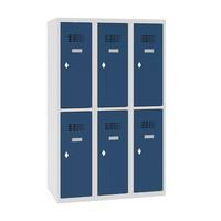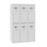 Niższe szafki szatniowe o konstrukcji spawanej, z sześcioma przedziałami, przeznaczone do szkół.