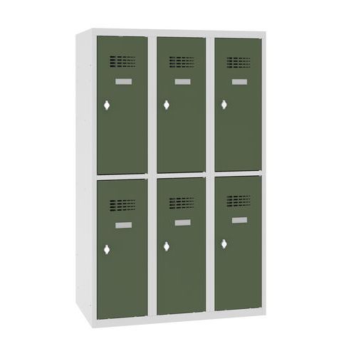 Niższe szafki szatniowe o konstrukcji spawanej, z sześcioma przedziałami, przeznaczone do szkół.