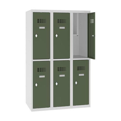 Niższa szafka szatniowa szkolna, 6 przedziałów, 300 mm, szara/zielona, zamek obrotowy
