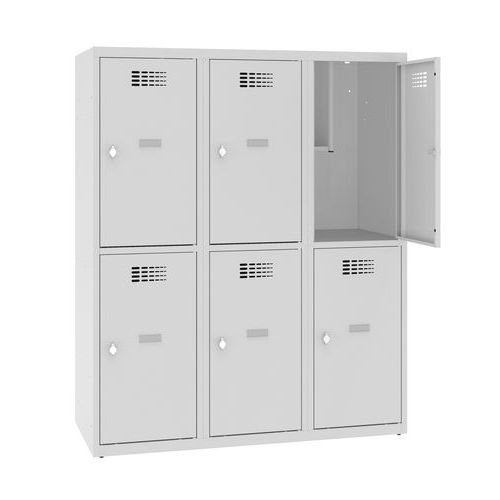 Niższe szafki szatniowe, z sześcioma oddzielnie zamykanymi przedziałami.