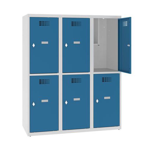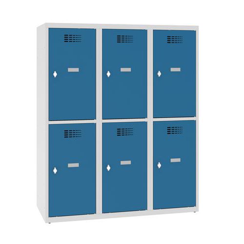 Niższe szafki szatniowe, z sześcioma oddzielnie zamykanymi przedziałami.