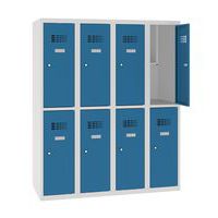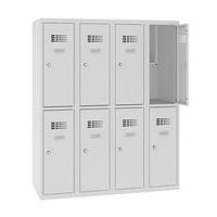 Niższe szafki szatniowe o konstrukcji spawanej, z ośmioma odrębnie zamykanymi boksami.