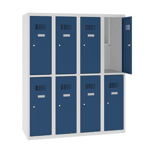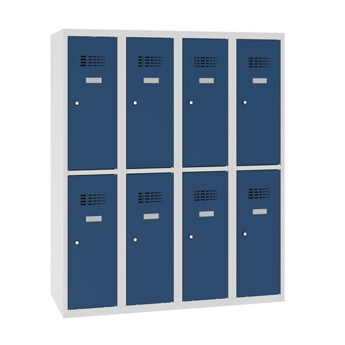 Niższe szafki szatniowe o konstrukcji spawanej, z ośmioma odrębnie zamykanymi boksami.