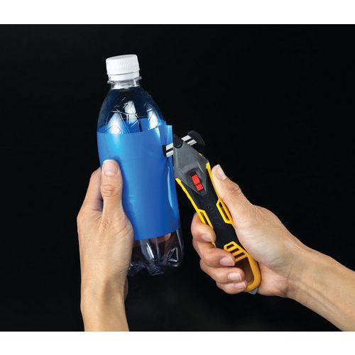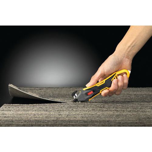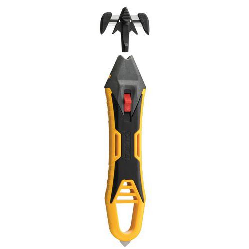 Wymienny nóż bezpieczny z ukrytym ostrzem. Jest to praktyczne i zapobiega zgubieniu ostrzy w miejscu pracy. Wyposażona jest w metalową końcówkę do odcinania pasków samoprzylepnych. Zabezpieczone ostrze gwarantuje brak kontaktu z palcami lub produktami znajdującymi się wewnątrz opakowania. Idealnie nadaje się do cięcia grubszych materiałów, takich jak dwuwarstwowa tektura, dywany i płyty gumowe.