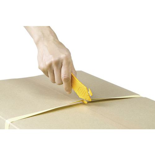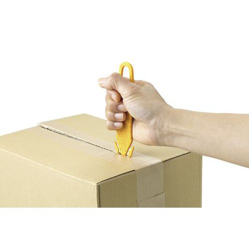 - Ukryte ostrze zapobiega kontaktowi z palcami lub produktami wewnątrz kartonu .