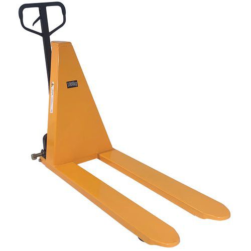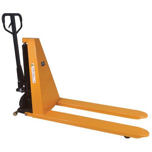 Wózek podnośnikowy umożliwia ręczne podnoszenie palet oraz innych ładunków na wymaganą wysokość. Podnoszenie za pomocą dźwigni ręcznej. Wyposażony w stabilizatory boczne do bezpiecznego przenoszenia na wysokości. Liczba naciśnięć uchwytu: szybkie: 28/wolne: 62. Wysokość podniesionych widełek wynosi +-85 mm. Nadaje się wyłącznie do palet EURO lub EPAL. Gwarancja producenta dla klienta : 10 lat Nośność (kg) : 1000 kg