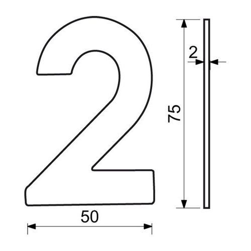 Numer ze stali nierdzewnej w projekcie 2D, wysokość 75 mm, znak „2”