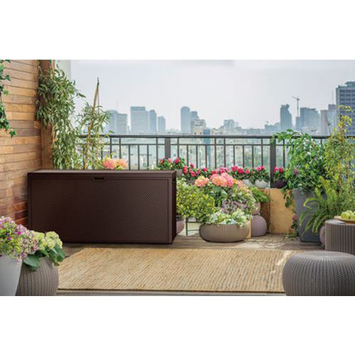 Plastikowy pojemnik do przechowywania sprzętu ogrodowego, poduszek i zabawek. W zestawie znajdują się kółka boczne rękojeści zapewniające lepszą manipulację. Łatwy montaż bez użycia narzędzi. Nadaje się do użytku na zewnątrz i wewnątrz budynków.