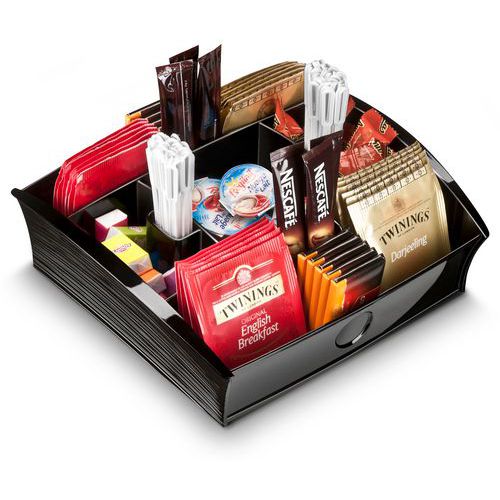 - wewnątrz przegródki na herbatę lub kawę w saszetkach, cukier, mieszadełka itp.