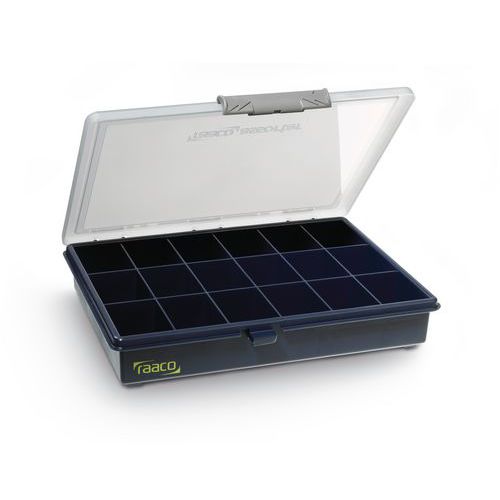 - Zamykany plastikowy organizer na drobne narzędzia i materiały. Przezroczysta pokrywa umożliwiająca szybki przegląd zawartości. Stałe przegródki.