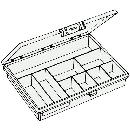 - Zamykany plastikowy organizer na drobne narzędzia i materiały. Przezroczysta pokrywa umożliwiająca szybki przegląd zawartości. Stałe przegródki.