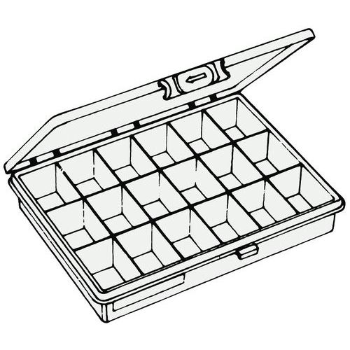- Zamykany plastikowy organizer na drobne narzędzia i materiały. Przezroczysta pokrywa umożliwiająca szybki przegląd zawartości. Stałe przegródki.