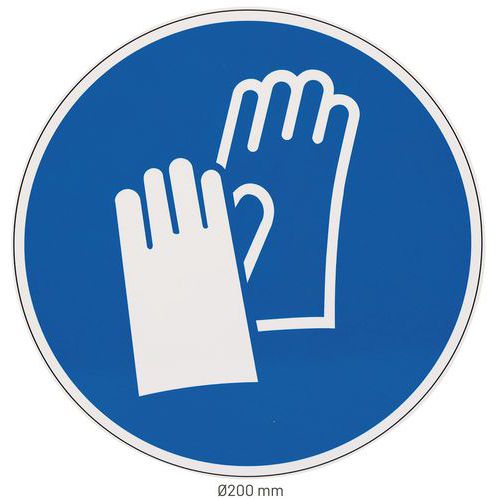 Okrągłe oznaczenie nakazowe wskazujące obowiązek noszenia rękawic ochronnych dla zapewnienia optymalnego bezpieczeństwa. Konstrukcja ze stali nierdzewnej odporna na gnicie. Laminacja polimerowa - chroni wydruk przed uszkodzeniami fizycznymi i filtruje część promieni UV. Nadaje się do użytku zewnętrznego i wewnętrznego.