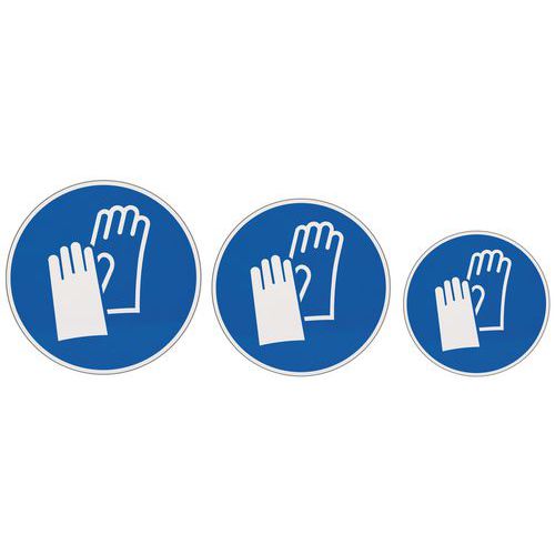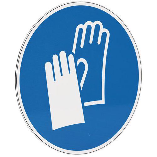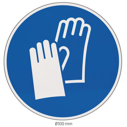 Okrągłe oznaczenie nakazowe wskazujące obowiązek noszenia rękawic ochronnych dla zapewnienia optymalnego bezpieczeństwa.